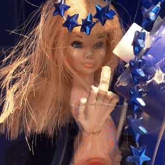 而在军队旁边,还有一位对着军队竖起中指的断腿芭比,而这样的内涵设定在他的作品中随处可见。