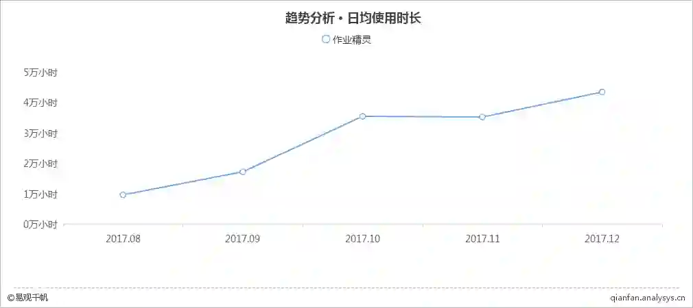 2017年8月-2017年12月作业精灵App月使用时长趋势