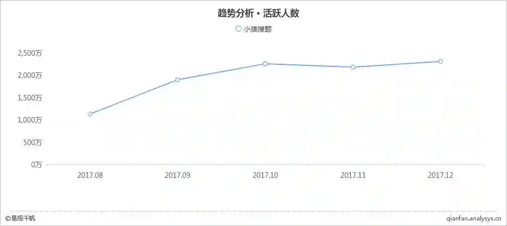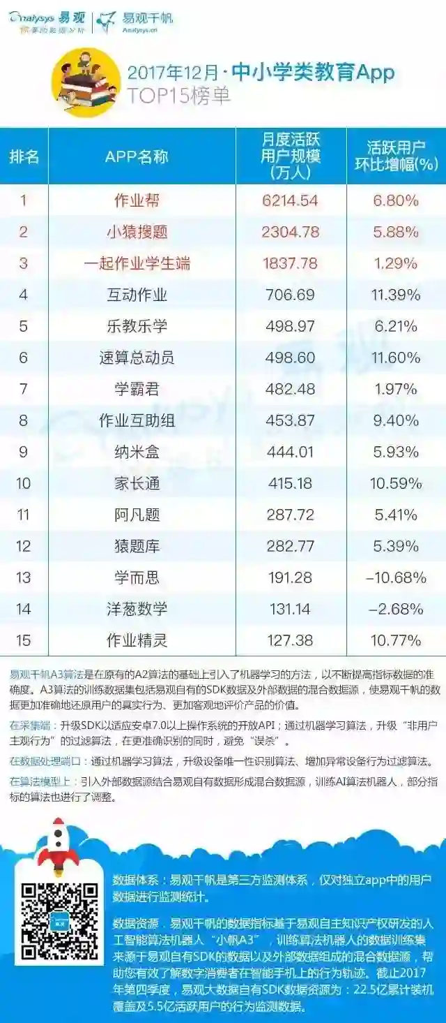 2017年12月的教育应用市场可以说处于旺季,一方面12月属常规校园日常时段,学生的作业练习等较为规律,对搜题、解题、辅导类应用需求较稳定;另一方面临近期末,各科的复习查漏也在紧锣密鼓地进行着,作业解疑类App使用频率出现短暂性爆发式增长小高峰,同时此阶段用户粘性也较强。