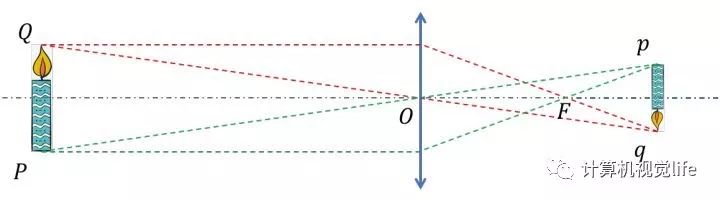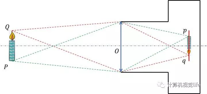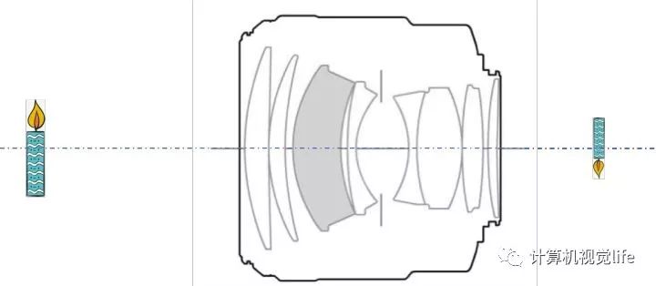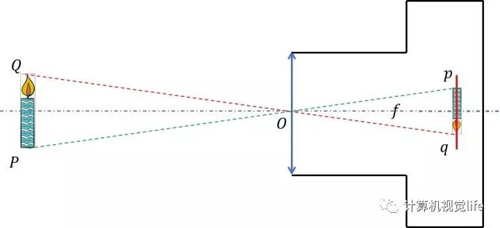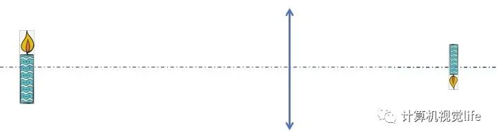 这里说的等效,只是针对物像共轭关系的等效,也就是光路的等效,镜头中之所以用了形态各异的透镜主要是为了消除各种各样的像差,提高清晰度。换句话说,等效透镜的目的绝不是为了在实际应用中取代镜头(毕竟一个镜头都好贵),只是为了帮助我们理解。这样我们就可以画出相机拍摄到清晰的蜡烛燃烧场景的草图,如下图。