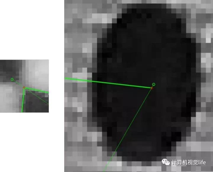 所以在标定板中,印刷了拓扑结构,广泛应用的是棋盘格和圆点格,这两种之所以成为主流,不仅是因为它们的拓扑结构明确且均匀,更重要的是检测其拓扑结构的算法简单且有效。棋盘格检测的是角点,只要对拍摄到的棋盘格图像横纵两个方向计算梯度就可获得;而圆点格的检测只需要对拍摄到的圆点格图样计算质心即可。假如你开发了一套非常完美的检测人脸全部特征的算法,你完全可以用你的照片当作标定板。按照我的经验,圆点格的效果应该是好于棋盘格,因为圆点质心的「透视不变性」要比棋盘格的角点稳定的多。下图是同样尺寸、同样比例棋盘格和圆点在最大重投影误差处的误差对比,红色十字是提取的角点/质心,绿色圆圈是针孔相机模型计算出来认为的角点/质心位置。