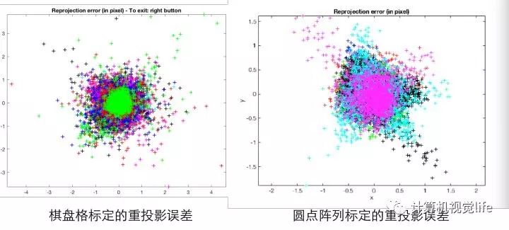 下图是棋盘格与圆点格的重投影误差图,显然圆点格的重投影误差的误差空间要小。