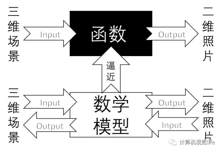 我们所处的世界是三维的,而照片是二维的,这样我们可以把相机认为是一个函数,输入量是一个场景,输出量是一幅灰度图。这个从三维到二维的过程的函数是不可逆的。相机标定的目标是我们找一个合适的数学模型,求出这个模型的参数,这样我们能够近似这个三维到二维的过程,使这个三维到二维的过程的函数找到反函数。