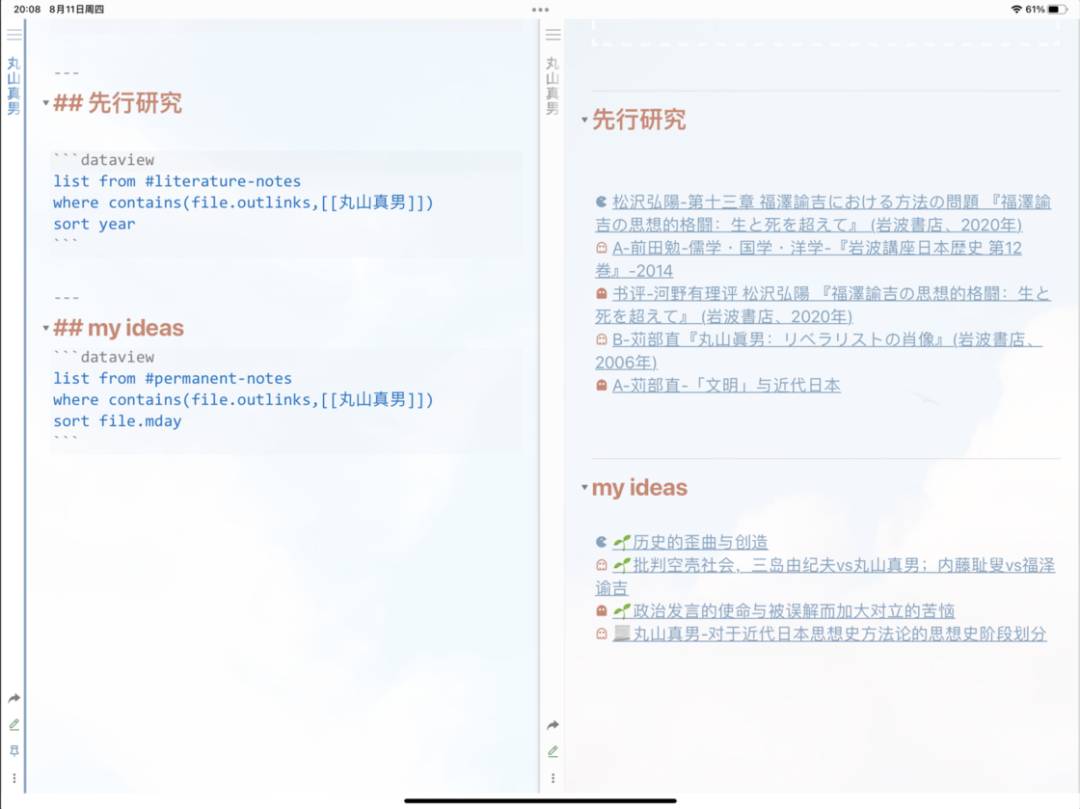 我在「丸山真男」这个条目里,写了左边的代码。上面的会帮我自动查找所有标有链接到这个文件的 literature notes ,并将他们视为言及丸山真男的先行研究。下面的则是查找链接到这个文件的 permanent notes,并将他们视为我关于丸山所做的永久笔记。