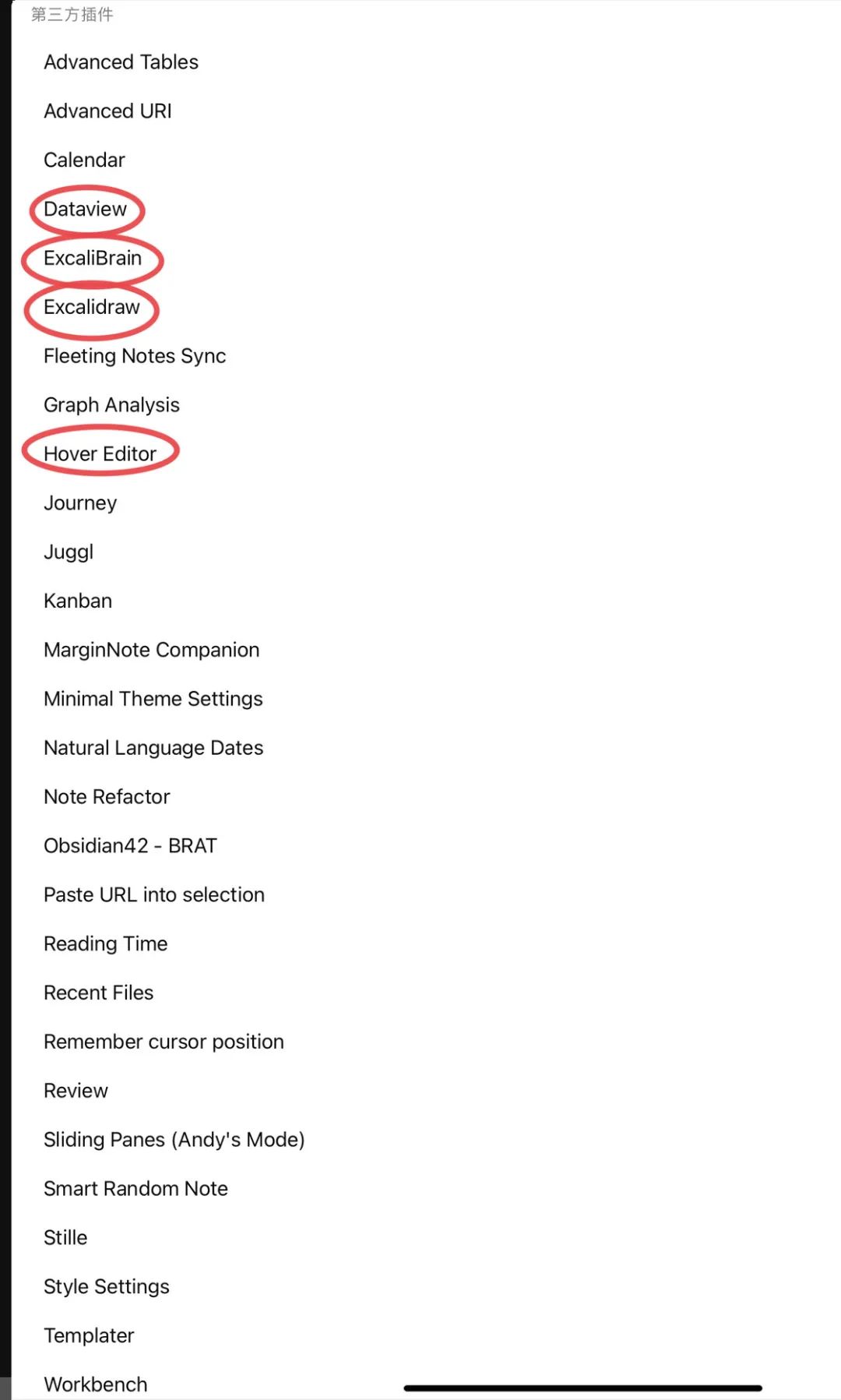 说到插件,则不得不提一提 Obsidian 中的各种强大插件。我个人安装了不少插件,要说起对学术研究最有帮助的,应该是画圈的这几个。