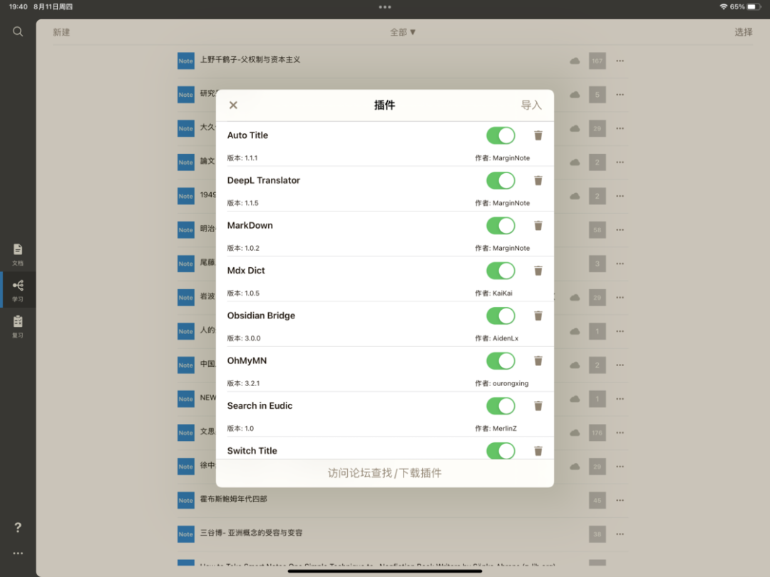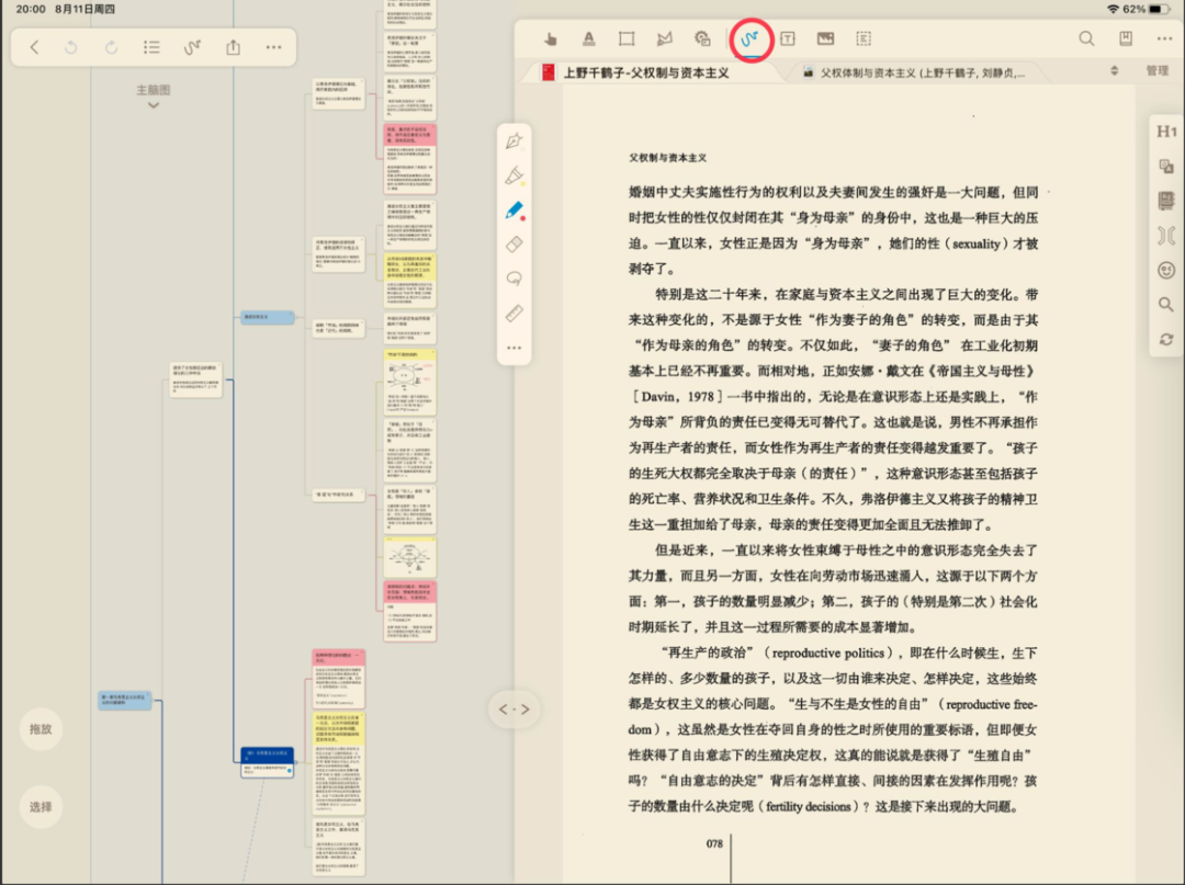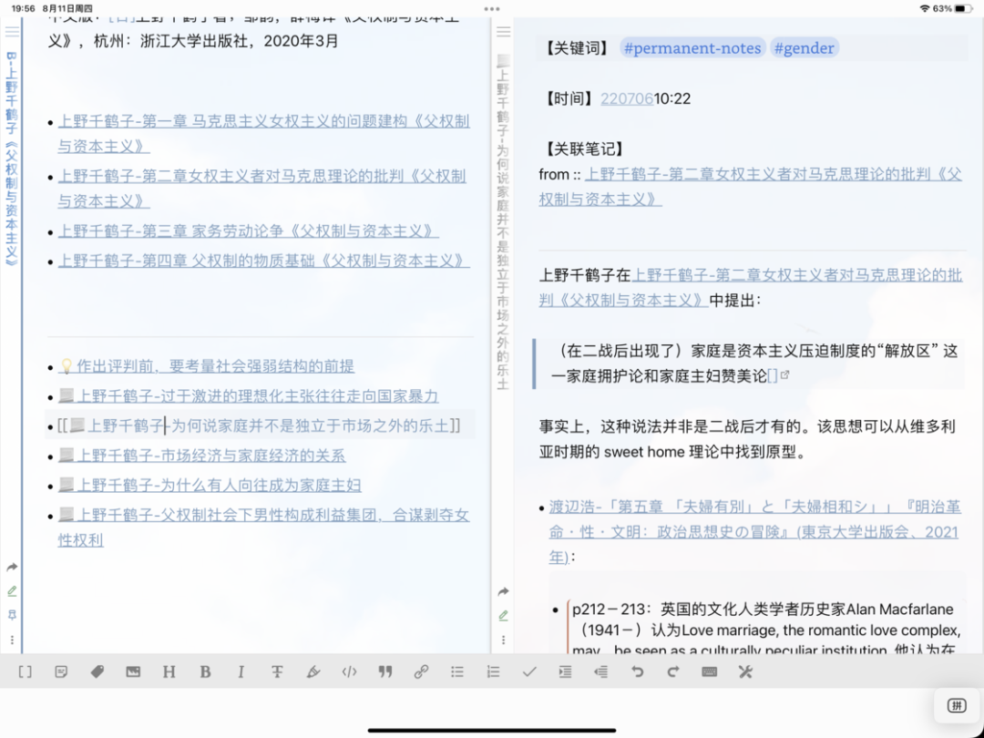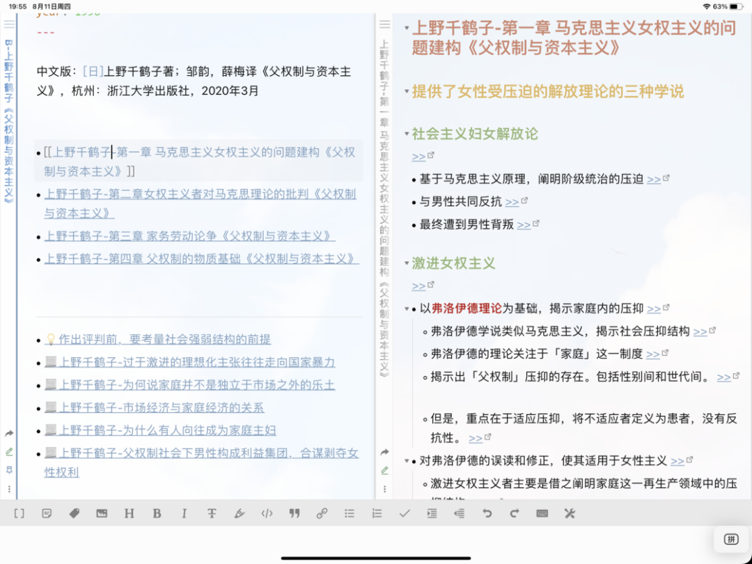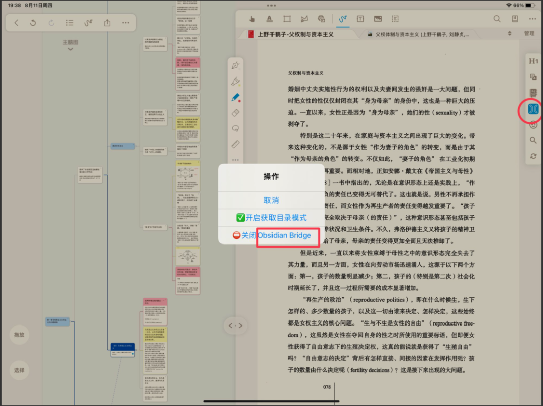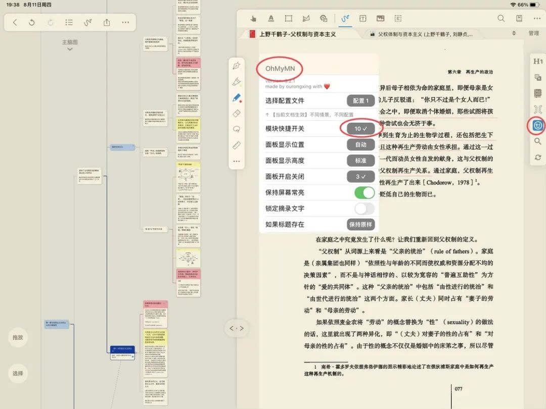 当大致浏览过发现要读的是一本逻辑结构完整,且体量不小的书籍时(譬如我最近正在读的是上野千鹤子的《父权制与资本主义》),我最常依赖的工具就是 MarginNote 3。关于这个工具,你几乎可以在所有地方找到使用教程,我无意再加赘述。我只说说我用起来得心应手的两个插件和我的使用方法。