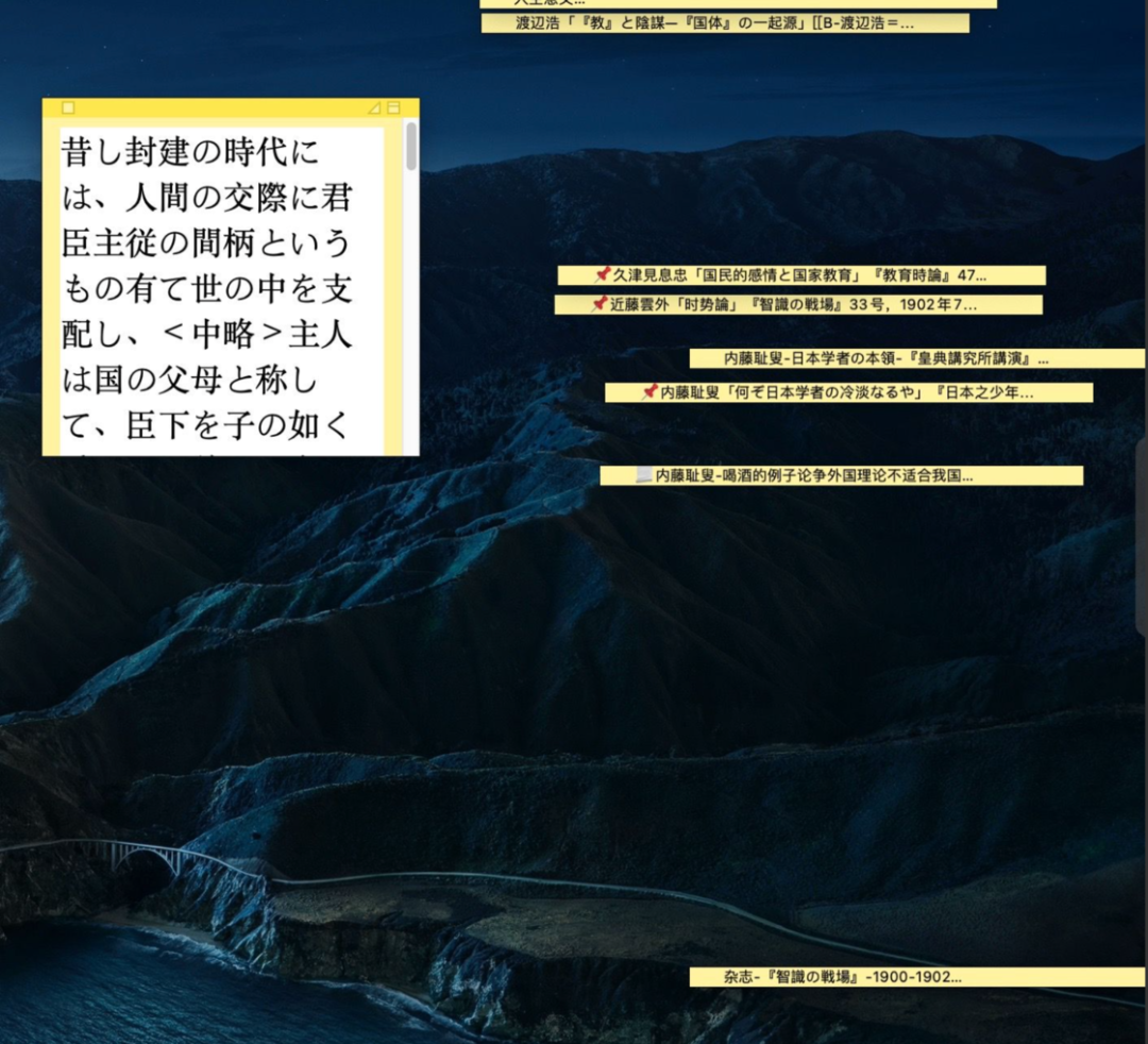 便签这个东西是电脑自带的。我发现在收集论文点子的时候,往往会出现这样的场景。譬如在 Obsidian 中任意浏览,发现能写的部分,就随手拷贝一下,希望能够有个白板来粘贴组织内容。又如,写作时发现一个想要引用的内容,就需要在