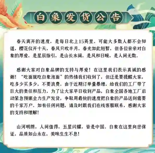 白象在线上店贴出公告称,因近期销量暴增,白象全国各地工厂启动紧急预案全力生产,争取最快的速度发货。并在公告中提醒,吃多少买多少,不要浪费。此前,白象因积极参与福利事业吸纳残疾人就业引起外界关注。(快科技)
