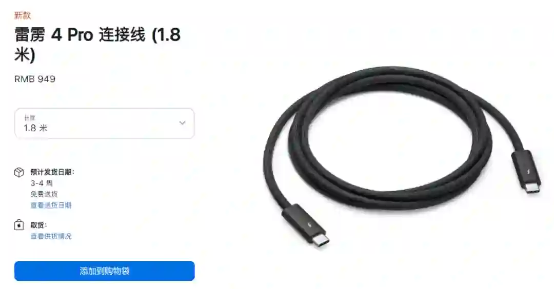 苹果官网上架了一根1.8米连接线,采用黑色编织设计,支持雷电3、雷电4、USB-C、USB接口的显示设备,最高数据传输速率可达40Gb/s,最高供电功率可达100W,售价949元。此外还将推出一根3米长的连接线,售价1169元。(雷科技)