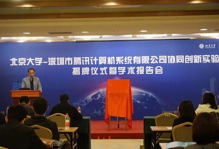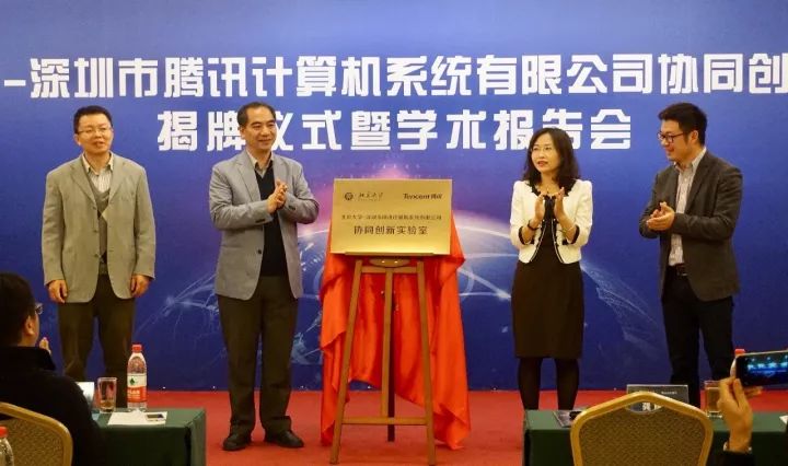 2017年10月17日,北京 -- 北京大学-深圳市腾讯计算机系统有限公司协同创新实验室正式揭牌。北京大学副校长中科院院士龚旗煌教授、腾讯公司副总裁王巨宏女士、腾讯公司数据平台部总经理蒋杰先生,北京大学科技开发部常务副部长姚卫浩,北京大学软件与微电子学院常务副院长吴中海教授、信息科学与技术学院副院长谢冰教授等来自北京大学各有关院系和腾讯公司的代表六十余人共同出席了揭牌仪式。基于双方共建的协同创新实验室,北京大学和腾讯公司将建立战略合作伙伴关系,共同建设集科研合作、人才培养、成果转化等为一体的产学协同创新平台。