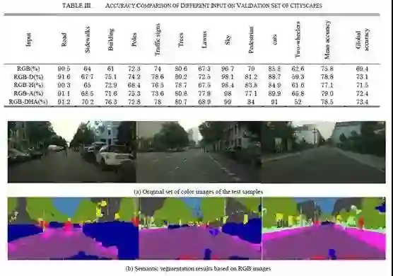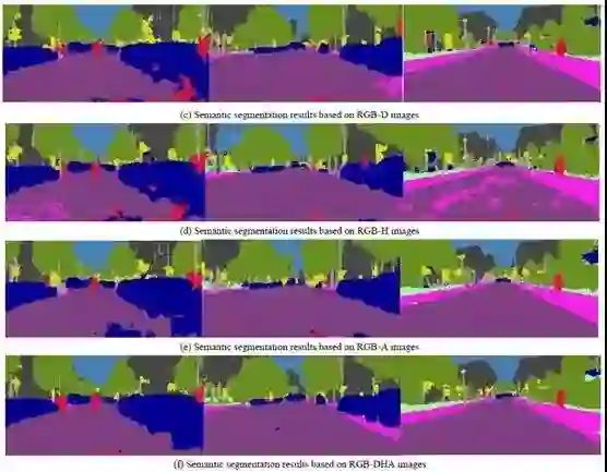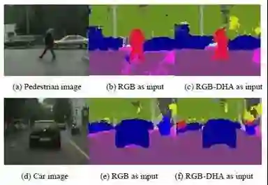 6通道RGB-DHA地图可以在语义分割中获得比仅使用RGB图像作为输入更好的结果,尤其是用于识别交通场景中的道路目标,例如行人和汽车。