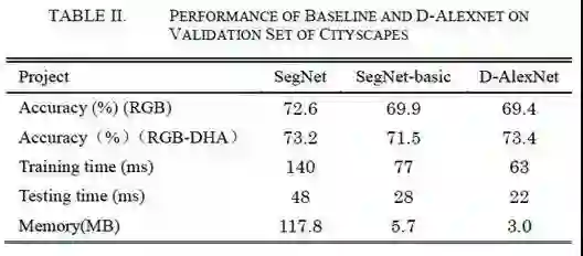 本文提出了一种基于新型深度完全卷积网络(D-AlexNet)和多特征映射(RGB-DHA)的交通场景语义分割方法。对于Titan X GPU上的每个400×200分辨率图像,网络可以实现22ms的良好实时性能。从原始RGB图像获得视差图、高度图和角度图,并融合成6通道图像以训练网络。实验表明,与使用RGB图像作为输入相比,使用多特征图作为网络的输入可以实现4%更高的分割精度。在未来,我们将重点关注更高效的深度网络,以联合语义分割,目标跟踪和参数识别。
