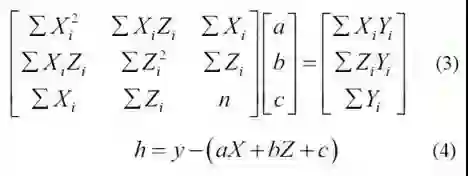 其中x和y是世界坐标系中点P的坐标,z是点P和相机之间的距离,f和b分别是摄像机的焦距和两个摄像机的基线长度,fy和Cy是相机的内部参数,y是像素的高度。由于摄像机的安装不能保证与地平面完全平行,因此需要进行校正。选择视差图中的地面区域的一部分,并且使用最小二乘法来拟合地面。通过假设拟合的地平面方程是Y = aX + bZ + c,a,b和c的值可以通过等式(3)获得。在校正地之后,可以通过等式(4)获得实际像素高度。