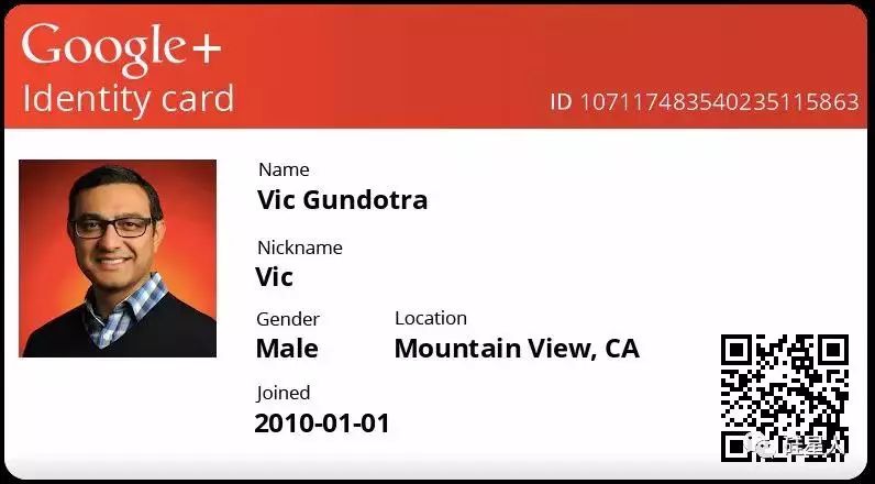 比如,当时环聊团队的工程师曾设计出一个“身份证”功能,人们输入自己的 Google+ ID,就能生成一个“身份证”。这名工程师还给冈多特拉生成了一张ID。