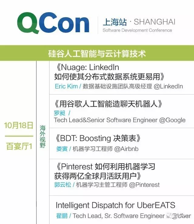 如果以上三天满满干货的日程都无法满足你的学习欲望,那10.15-16两天会前深度培训一定适合你,围绕大数据、机器学习、深度学习、TensorFlow等技术,展开从入门到实践的落地分享。Streamlio核心创始成员翟佳、PayPal大数据研发架构师张彭善已确认加盟。