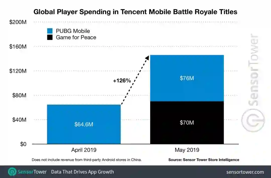 Sensor Tower数据显示,今年5月份,《PUBG Mobile》收入达到了1.46亿美元(约合人民币10.13亿元)。其中,腾讯在海外发行的《PUBG Mobile》上个月在苹果和谷歌官方应用商店中的的收入为7600万美元。而《和平精英》5月份在中国市场的收入达到了7000万美元。