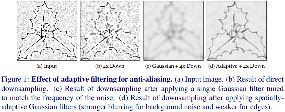 为解决上述方法存在的问题,作者提出了一种内容自适应下采样方案,效果见上图d。它在不同位置、不同通道执行不同的高斯滤波,因此可以更好的保持有用信息并避免Aliasing问题。该文的贡献主要包含以下几点: