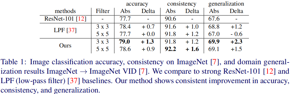该文提出了一种内容自适应低通滤波器层用于消除Aliasing问题,作者在多个任务(ImageNet分类、COCO实例分割、Cityscapes语义分割)上验证了所提方法的有效性与泛化性能。
