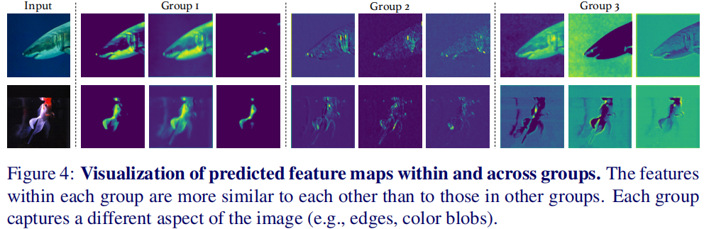 下图给出了不同组学习到的滤波器可视化效果图,同组内的通道特征具有相似的表现形式。通过这种方式,所学习到的滤波器可以针对特征通道的不同频率进行自适应学习,同时可以节省计算量。