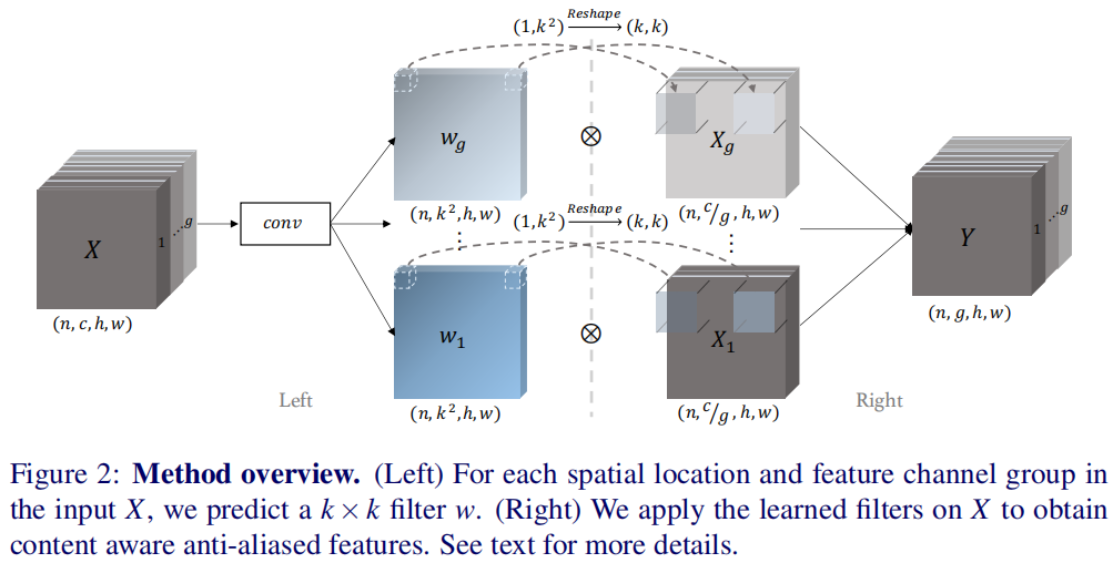 不同通道特征会从不同角度捕获输入的特征信息,进而呈现出边缘、色彩等差异。因此,作者认为应该对不同通道采用不同的下采样滤波器。基于此,作者将输入通道划分为k组,对每一组预测一个低通滤波器