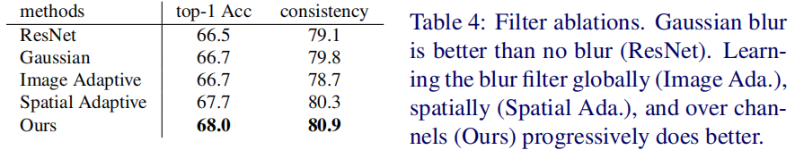 下表给出了所提方法与LPF(低通滤波器)方法的性能对比,可以看到:所提方法取得了更好的性能提升。相比固定模糊核方法,所提方法取得了0.6%的性能提升;所提方法不仅具有更好的指标,同时具有更好的一致性度量指标。