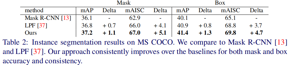 下表给出了所提方法在COCO实例分割任务上的性能对比。可以看到:所提方法取得了更好的性能提升。相比LPF,所提方法取得了0.4mAP的Mask指标提升,0.5mAP的Box指标提升。