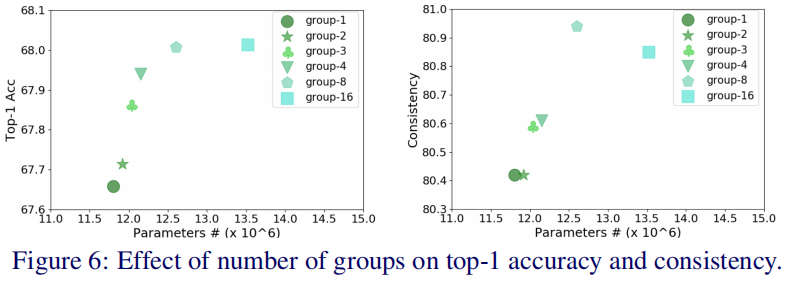 此外,作者还给出了不同分组下的性能对比,见下图。可以看到:提升分组数有助于提升模型性能,当分组数达到8后性能饱和。