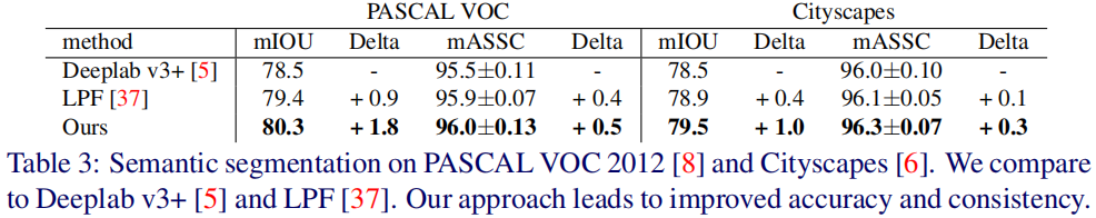 下表给出了所提方法在Cityscape语义分割任务上的性能对比。可以看到:所提方法取得了更高的指标。相比LPF,所提方法取得了0.9mIOU@VOC指标提升与0.6mIOU@Cityscapes指标提升。