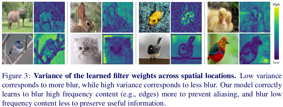 在该部分内容,我们将分析一下所学习到的滤波器的表现行为。首先,先来看一下滤波器的空间自适应性,见下图。可以看到:当图像内容包含高频信息时,所学习到的滤波器方差非常小,此时需要采用进行模糊以避免Aliasing;相反,当图像内容为平坦区域时,所学习到的滤波器的方差会比较大,此时需要进行更少的模糊以避免Aliasing。