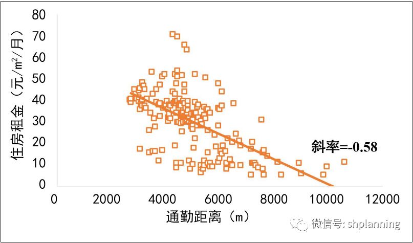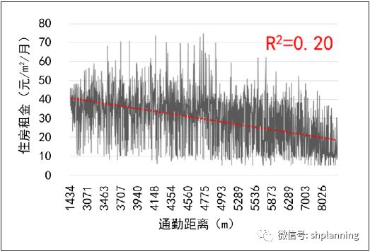 在传统竞租模型中,由于出行距离的影响,住房距就业中心越远,单位面积租金越低,这也与我们的常识相符。