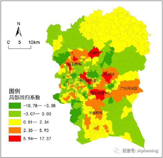 出行距离对住房租金影响的局部回归系数存在截然相反的情况,说明城市中存在一些居民日常出行模式与周边有差异的社区。