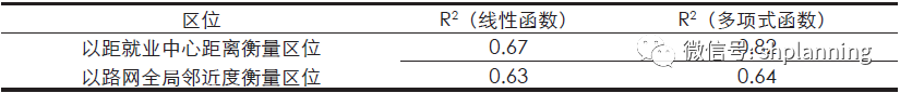 进一步探讨区位与出行距离的拟合关系发现,将上述两种区位变量与住房租金建立线性函数与多项式函数都能获得较好的拟合优度。