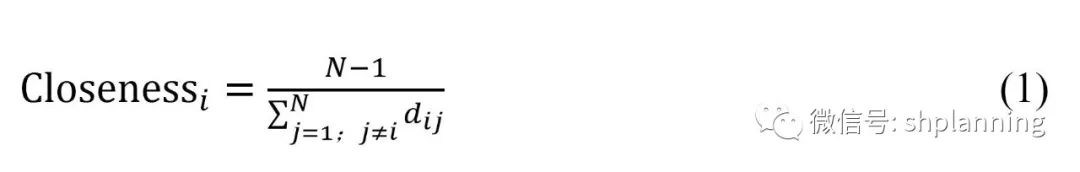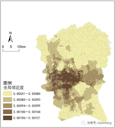 在基于空间句法的道路网络分析中,邻近度(Closeness)是道路网络可达性的关键指标,表示在给定的研究范围内,某一条道路与其他所有道路的邻近程度,也即通过最短的网络路径到达其他所有道路的便捷程度。