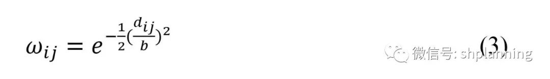 式(3)中,ωij为社区i和社区j之间的空间权重Gauss函数,b为GWR分析的带宽,dij是社区i和社区j之间的距离。