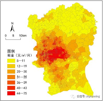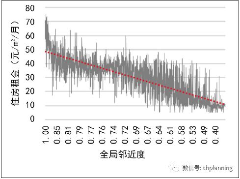 当以距就业中心的距离衡量区位时,发现距就业中心距离与住房租金空间分布的总体趋势接近,但没能反映出诸多城市形态因素的影响。