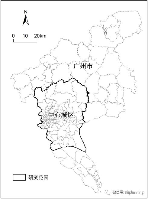 本文以广州市2014年行政区划调整后的中心城区为研究范围,包括越秀区、海珠区、荔湾区、天河区、白云区、黄埔区、番禺区、萝岗区8个市辖区,总面积1 987 km2。