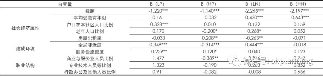 对本文的广州案例而言,多项logistic回归的结果显示,社区居民社会经济属性、居民职业结构、社区建成环境3类因素能显著地区分低通勤正显著(LP)、高通勤正显著(HP)、低通勤负显著(LN)和高通勤负显著(HN)4类社区。