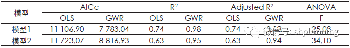 由于局部变量的引入,模型1与模型2的拟合优度相比全局线性回归(OLS)模型都有了较大提升,但两个模型的内涵有较大的差别。