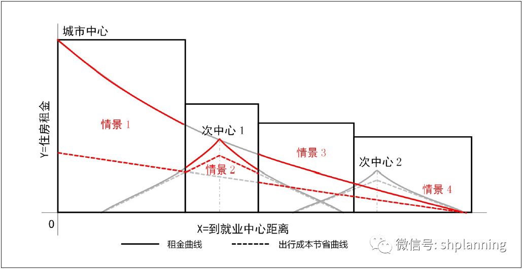 ③现代多中心城市的住房竞租模型是在多种情景下发挥作用的,不同的情景组合导致出行距离与住房租金关系的空间分异。