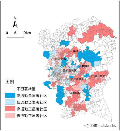 低通勤正显著社区在空间上集中于城市新城新区及其周边,如天河商务区的北侧、大学城、白云新城、科学城等,典型特征是全局邻近度较高但服务设施密度相对较低、户口在本社区的人口比例较低。