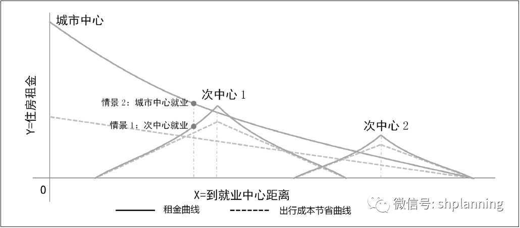 城市次中心的竞租曲线可能受到城市中心的影响,是多种情景的混合,既有追求更短出行距离在次中心就业的部分,又有追求城市中心带来的机会等附加价值而前往城市中心就业的部分。