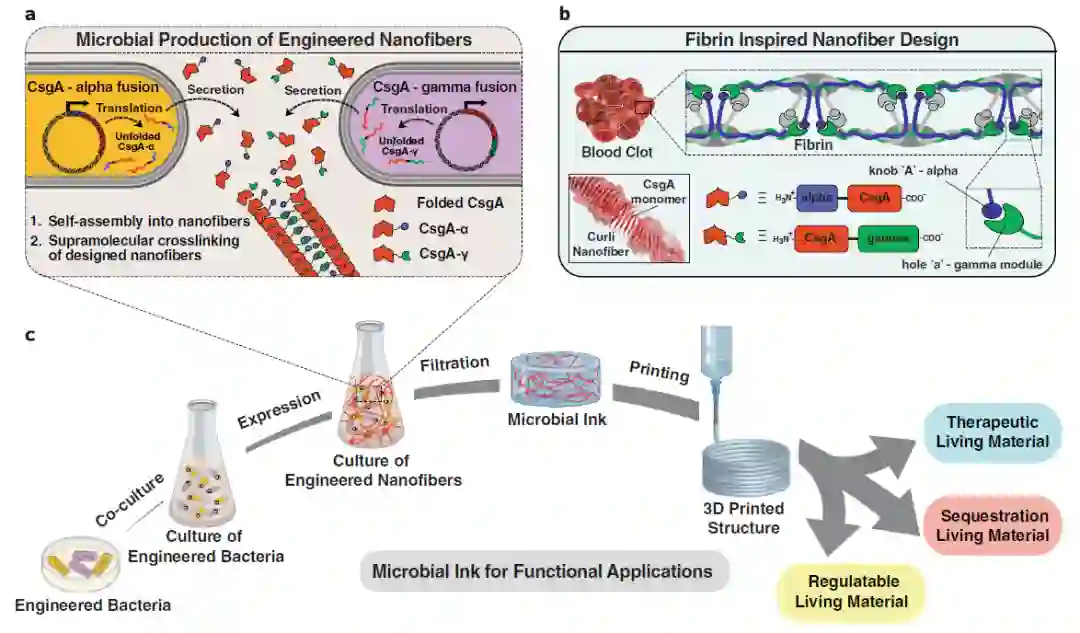 分泌后,CsgA-α 和 CsgA-γ 单体通过球状孔结合相互作用自组装成交联的纳米纤维。b展示了旋钮和孔域来自于纤维蛋白,它们在血凝块形成过程中的超分子聚合环节起到了关键作用。图中的 c 则显示,整个从工程蛋白质纳米纤维来生产微生物墨水的方案,涉及标准的细菌培养、有限的加工步骤,并且不必添加外源聚合物。最后微生物墨水被 3D 打印,来获得功能性生物材料。