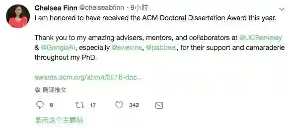 「很荣幸可以获得今年的 ACM 最佳博士论文奖。感谢我的导师和同事在我博士期间给予的支持和友谊,尤其是导师 Sergey Levine(UC 伯克利助理教授)和 Pieter Abbeel(UC 伯克利教授)。