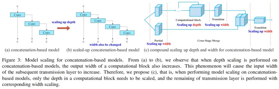 上述方法主要用于诸如PlainNet或ResNet等架构中。当这些架构在执行放大或缩小过程时,每一层的in-degree和out-degree都不会发生变化,因此可以独立分析每个缩放因子对参数量和计算量的影响。然而,如果这些方法应用于基于concatenate的架构时会发现当扩大或缩小执行深度,基于concatenate的转换层计算块将减少或增加,如图3(a)和(b).所示