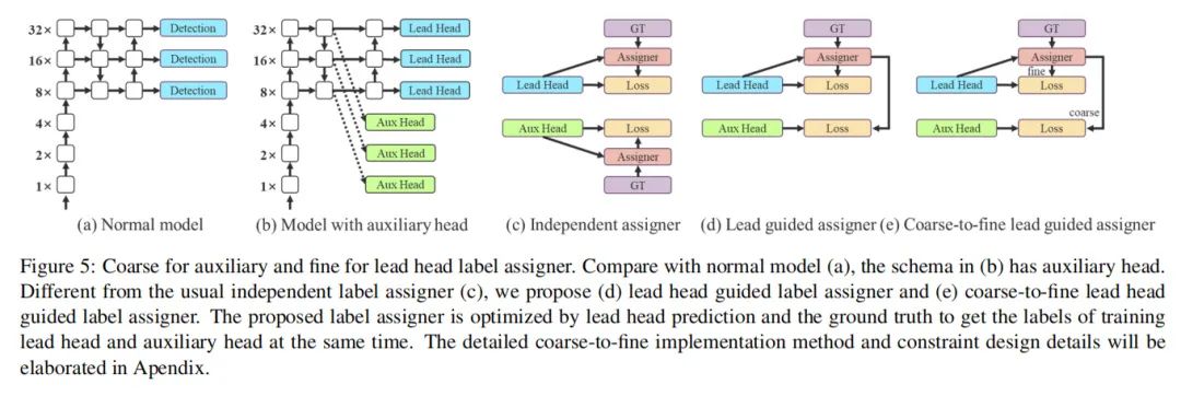 无论auxiliary Head或lead Head的情况如何,都需要对目标目标进行深度监督培训。在软标签分配人相关技术的开发过程中,偶然发现了一个新的衍生问题,即“如何将软标签分配给 auxiliary head 和lead head?”据我们所知,相关文献迄今尚未对这一问题进行探讨。目前最常用的方法的结果如图5(c)所示,即将 auxiliary head 和lead head分开,然后使用它们自己的预测结果和GT来执行标签分配。本文提出的方法是一种新的标签分配方法,通过lead head预测来引导 auxiliary head 和lead head。换句话说,使用lead head预测作为指导,生成从粗到细的层次标签,分别用于 auxiliary head 和lead head的学习。所提出的2种深度监督标签分配策略分别如图5(d)和(e)所示。