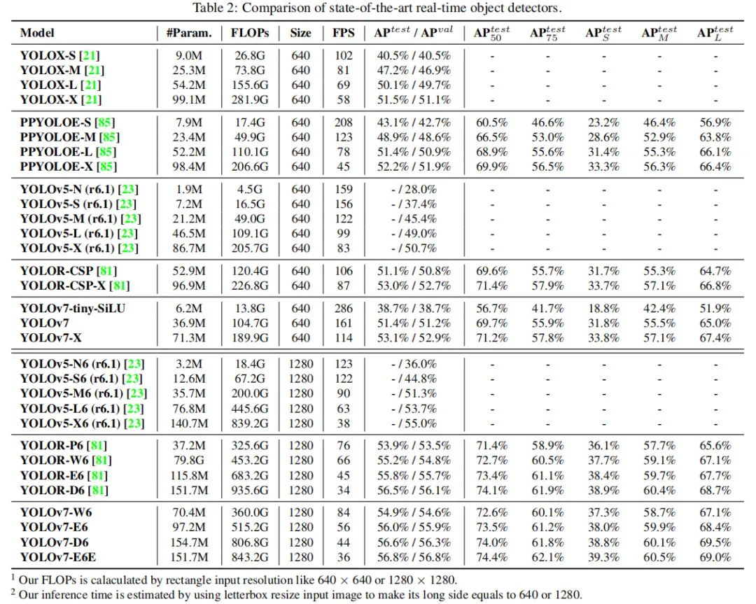 YOLOv7-E6 目标检测器(56 FPS V100,55.9% AP)比基于Transformer的检测器 SWIN-L Cascade-Mask R-CNN(9.2 FPS A100,53.9% AP)的速度和准确度分别高出 509% 和 2%,并且比基于卷积的检测器 ConvNeXt-XL Cascade-Mask R-CNN (8.6 FPS A100, 55.2% AP) 速度提高 551%,准确率提高 0.7%,以及 YOLOv7 的表现还优于:YOLOR、YOLOX、Scaled-YOLOv4、YOLOv5、 DETR、Deformable DETR、DINO-5scale-R50、ViT-Adapter-B 和许多其他速度和准确度的目标检测器。此外,只在 MS COCO 数据集上从零开始训练 YOLOv7,而不使用任何其他数据集或预训练的权重。