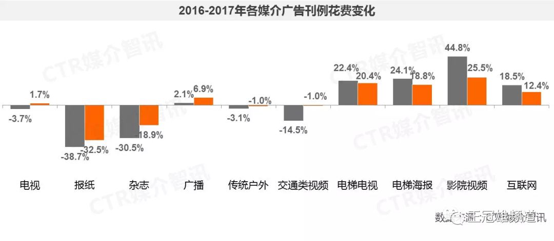 中国广告市场2015年下降2.9%,2016年下降0.6%,2017年中国广告终于涨了4.3%,全年传统媒体同比增长0.2%,四年来首次实现正增长,电视广告从2016年下降3.7%逆转为2017年增长1.7%。而所有媒体中增长最快的是电影广告25.5%,其次是电梯电视20.4%,第三是电梯海报18.8%。作为中国电梯媒体和影院媒体的绝对领导者,分众传媒拉动了整个广告市场的回升。