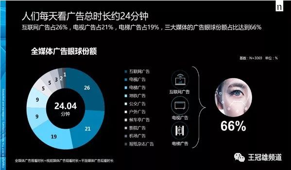 尼尔森的数据显示:人们每天收视广告的时长约24分钟,其中26%来自于互联网广告,21%来自于电视广告,19%来自于电梯广告。