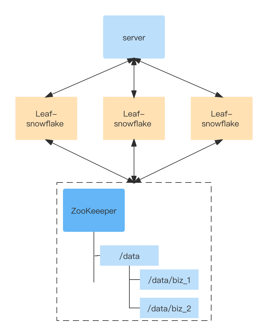 用Zookeeper顺序增、全局唯一的节点版本号,替换了原有的机器地址。解决了时钟回拨的问题。前面介绍ZooKeeper的缺点,强依赖ZooKeeper、大流量下的网络瓶颈。下图的方案在Leaf-snowflake 中通过缓存一个ZooKeeper文件夹,提高可用性。运行时运行时,时差小于5ms会等待时差两倍时间,如果时差大于5ms报警并停止启动。