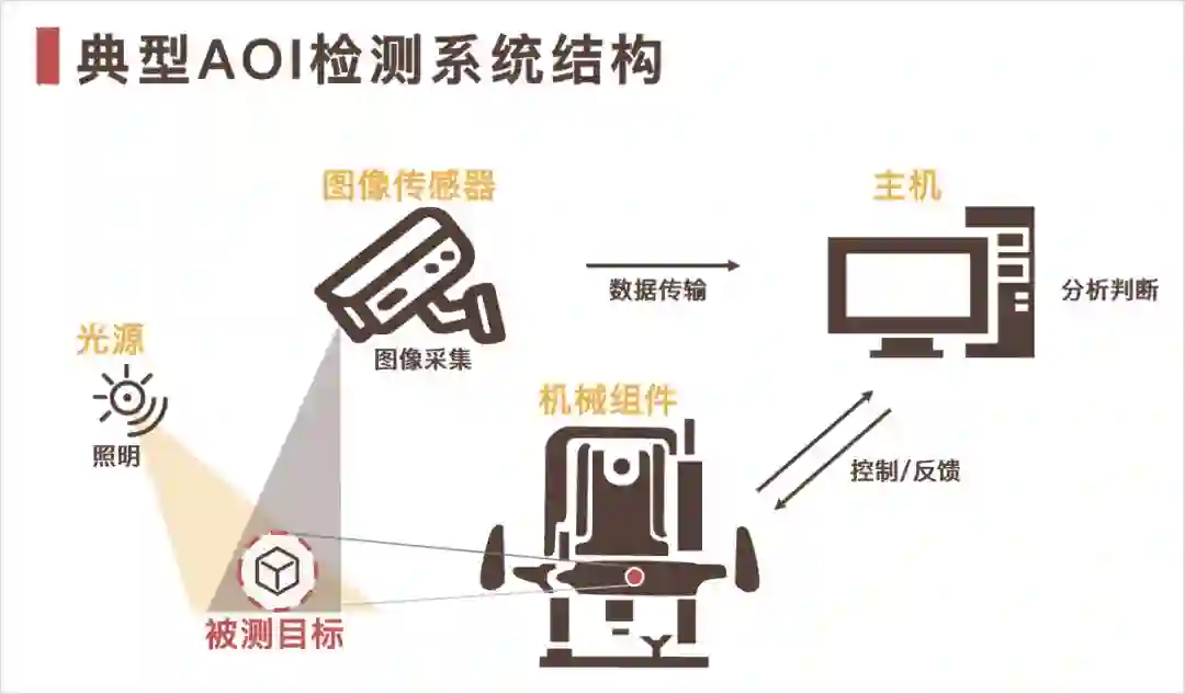 典型AOI检测系统的硬件一般包括5个部件:图像传感器、主机、光源、机械组件和机体外壳。